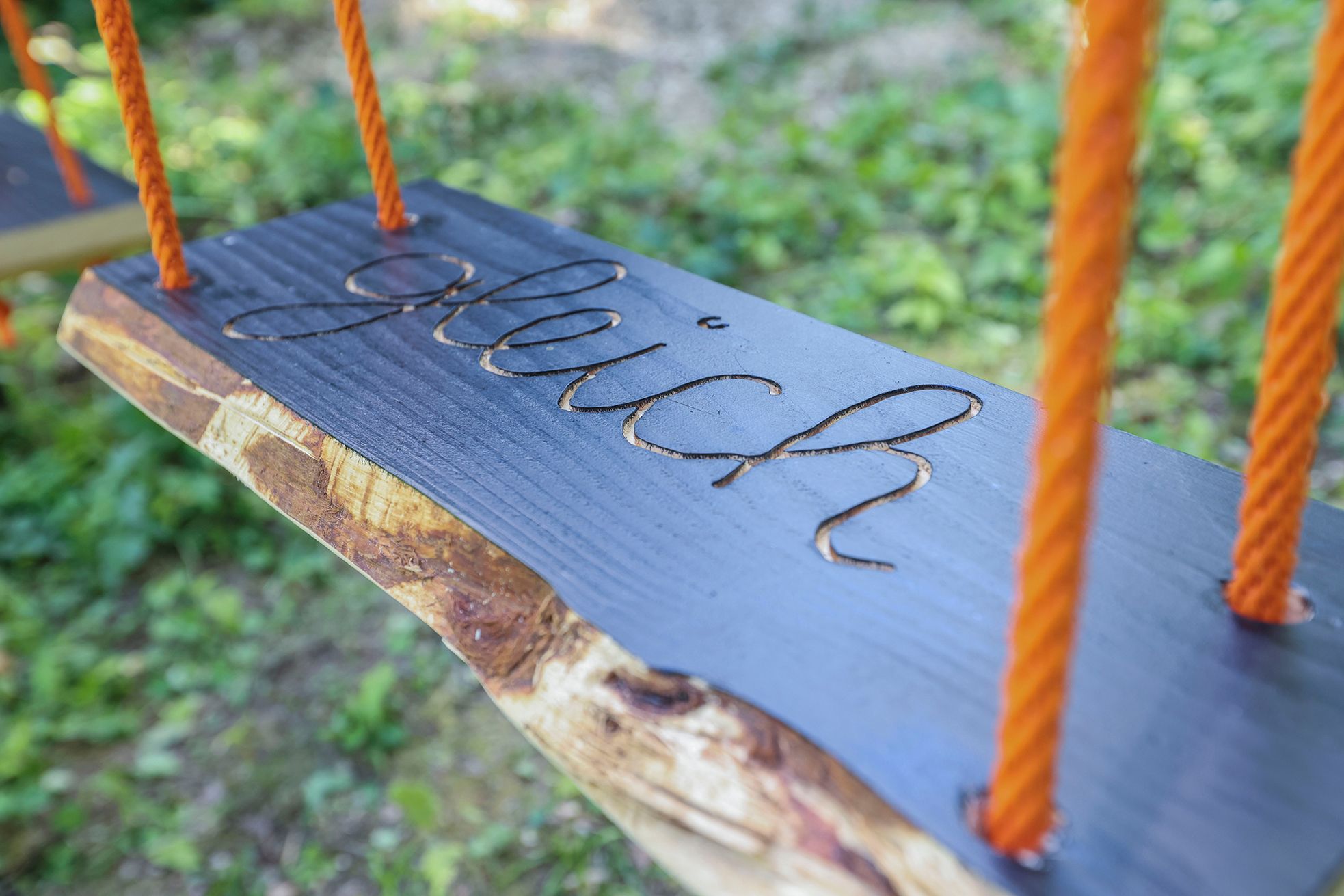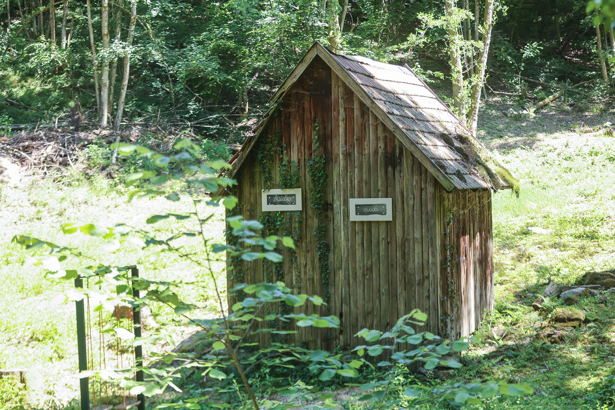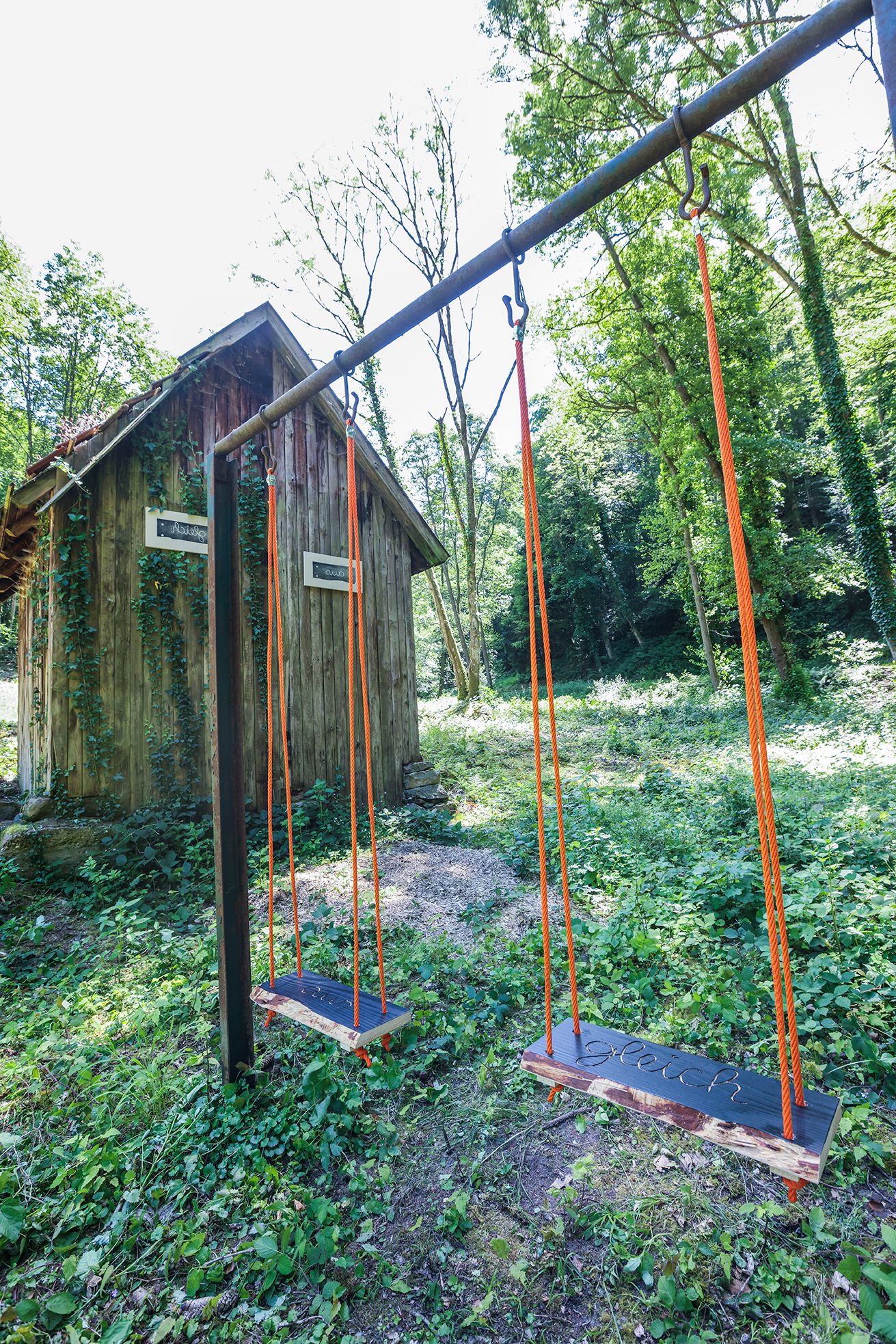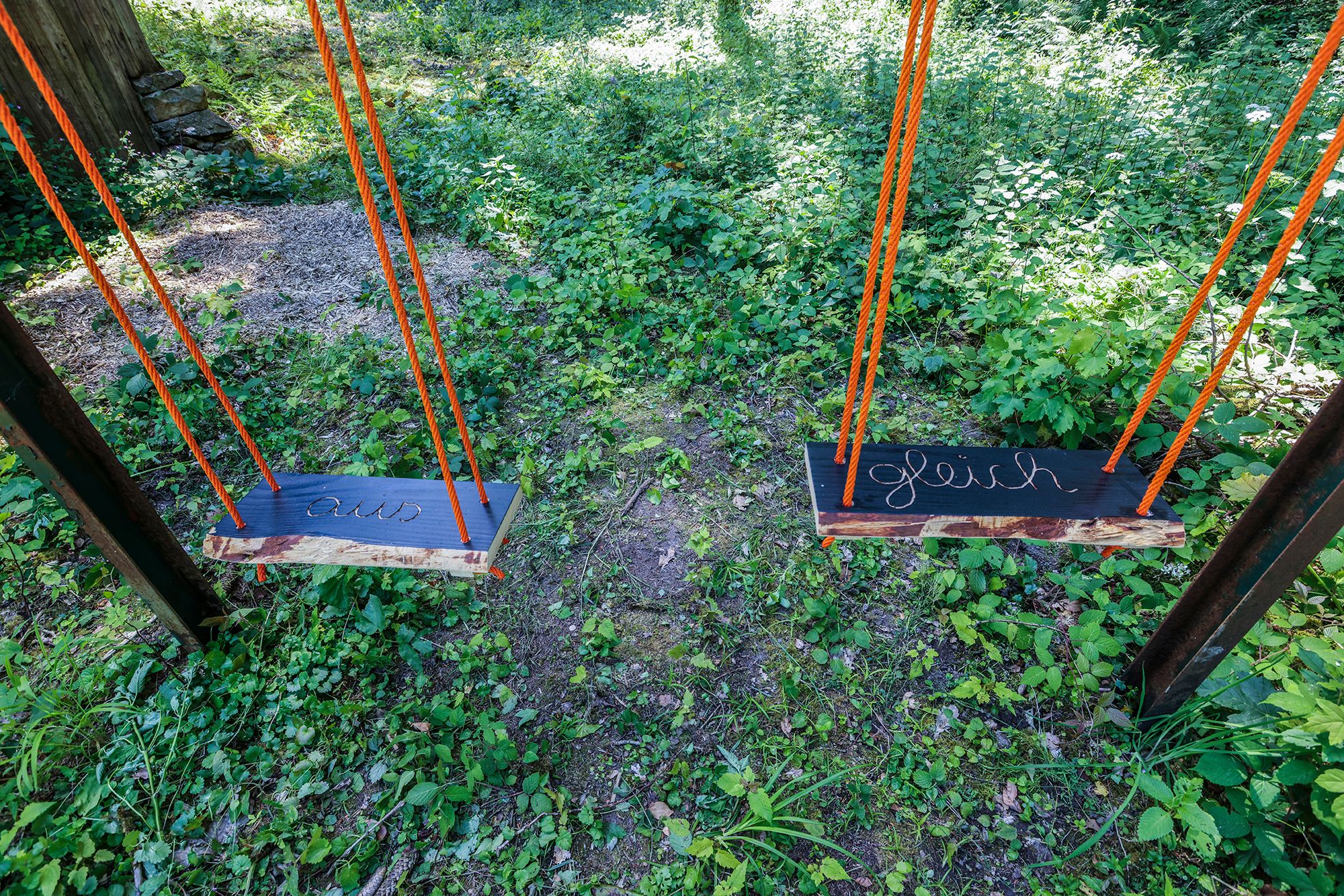 An einem vorgefundenen Stahl-Gerüst hängen zwei Schaukeln, beschriftet mit den in das Holz der neu installierten Schaukelbretter eingefrästen Worten „aus“ und „gleich". Deren Abdrücke auf Tuch sind als Bilder an der zugehörigen Holzhüttenfassade installiert. „aus gleich“ bzw. „gleich aus“. Hin- und Zurück, rauf und runter dreht sich bei Benutzung durch eigene Energie die Sicht auf das Umfeld und doch immer um einen Mittelpunkt. Das scheinbar kindliche Spiel bekommt so eine schwungvolle Wendung in die Realität. Beide Werke sind charakteristisch für die Arbeit des „änderungsateliers“: Spielerisch wird der Kunstbegriff dabei immer wieder neu erfunden, stets heiter und ungekünzelt. Nachvollziehbar und sogar nachempfindbar.