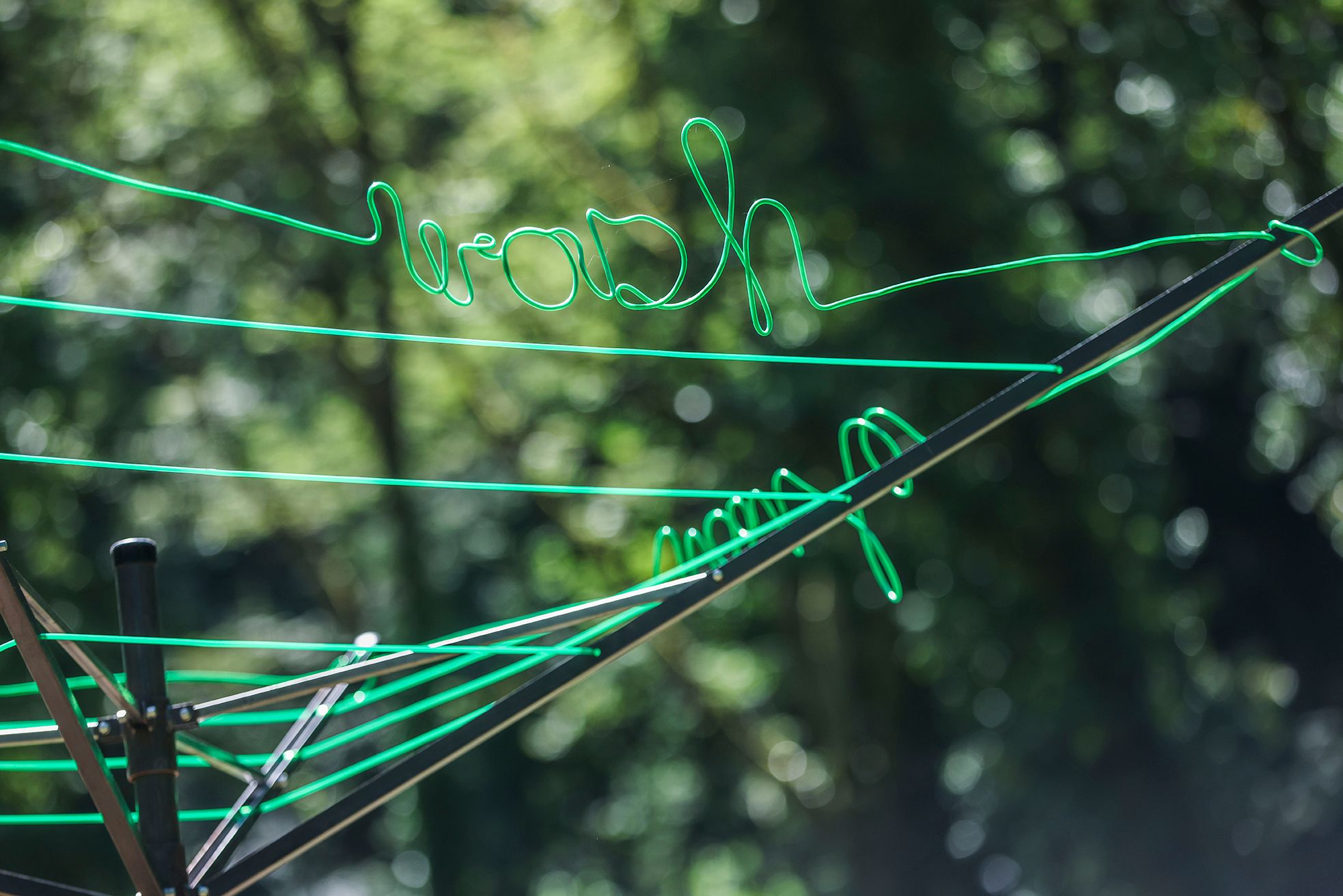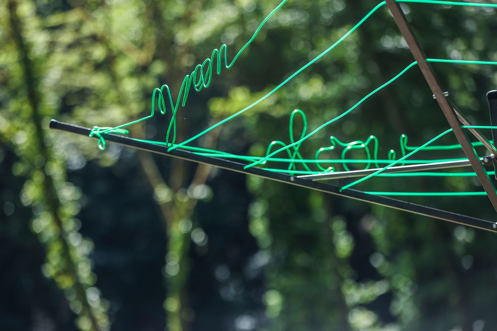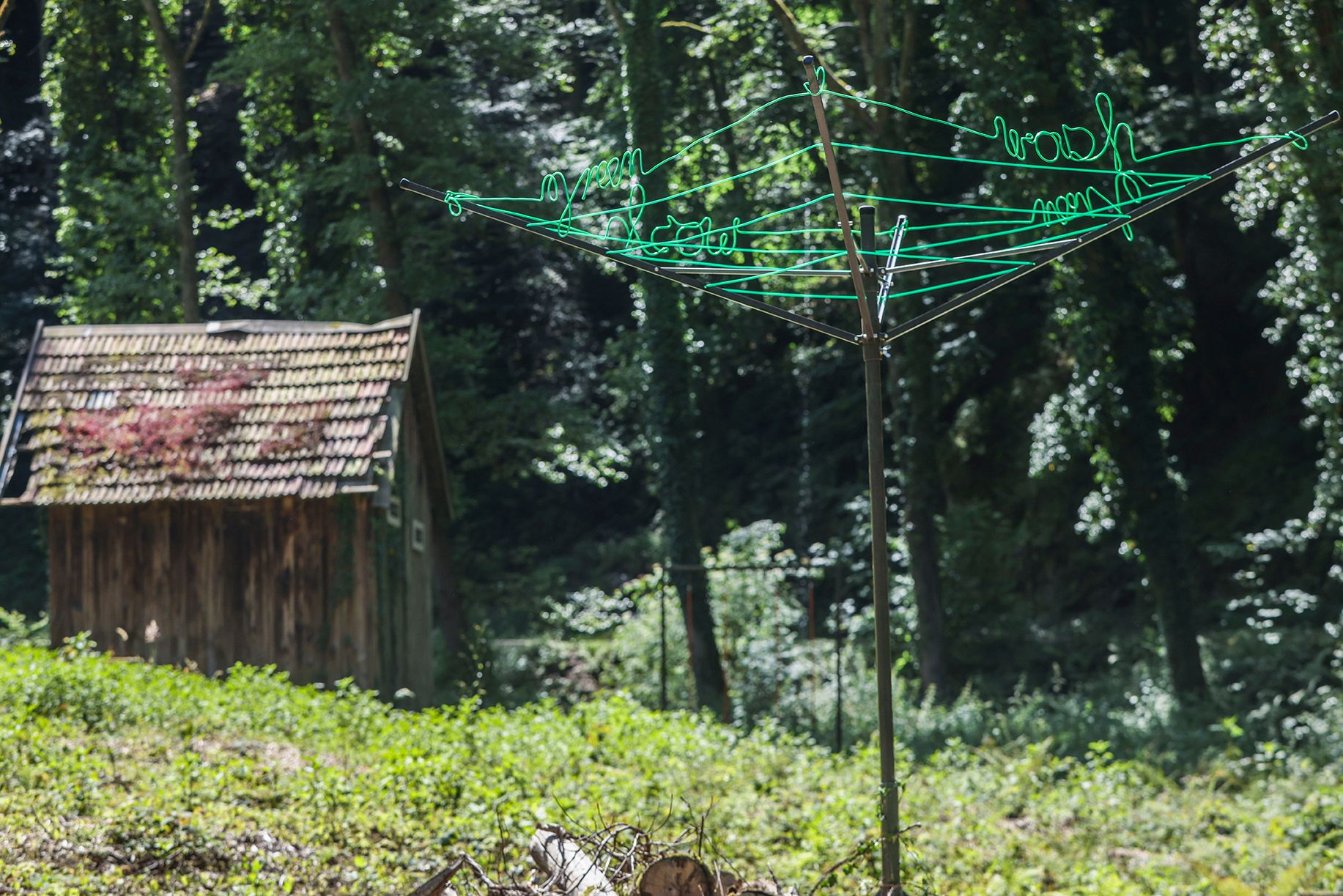 Eine Wäschespinne, eingepflanzt in einen vorhandenen Baumstumpf, ist mit grünen Wäscheleinen bespannt, die als Worte „green wash green wash …“ geformt sind. Die Installation nimmt Bezug auf Unternehmensstrategien, den Eindruck von Umwelt Freundlichkeit zu erwecken, obwohl keine entsprechenden Nachhaltigkeits-Maßnahmen existieren und zeigt gleichzeitig eine Aufforderung, eigenes Verhalten zu überdenken.
