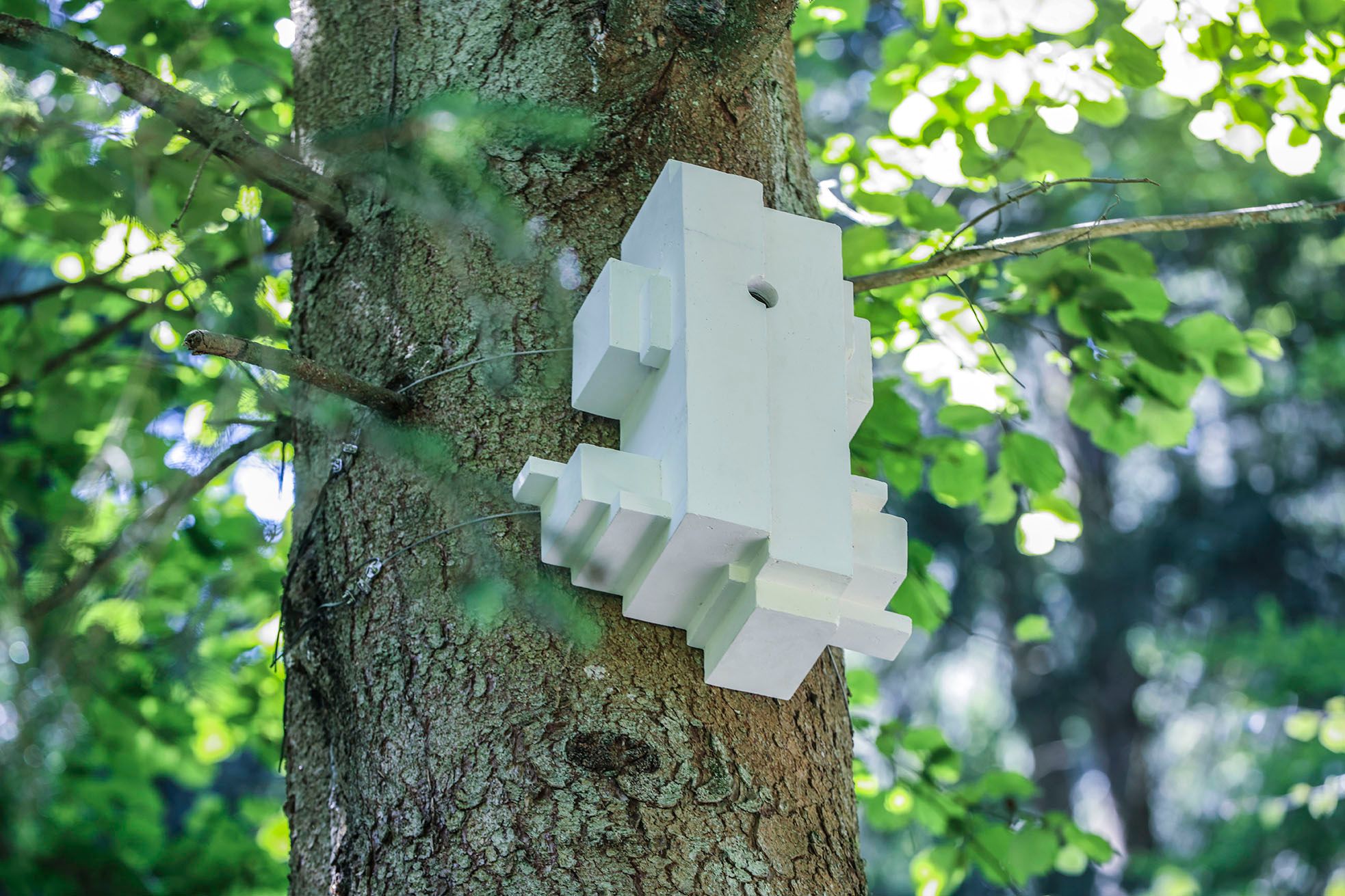 Und wenn sie sich für eines entscheiden, was gab dafür den Ausschlag? Werden sie wirklich das Objekt zuerst wählen, das im Stile der biomorphe Abstraktion geformt ist, einer Stilrichtung, der man nachsagt, sie sei der Natur und auch dem Menschen näher und vielleicht sogar zuträglicher? Oder werden sie sich für das konstruktivistische Objekt entscheiden, dem Objekt, das am ehesten noch einem normalen Nistkasten ähnelt? Sind Vögel bereits so weit durch uns Menschen geprägt? Oder gibt es so etwas wie ein besseres Objekt? Und wenn ja, woran lässt sich das festmachen? Am Platzangebot oder der inneren Form kann es nicht liegen, denn die sind bei beiden Nistkästen identisch und entsprechen handelsüblichen Nistkästen.