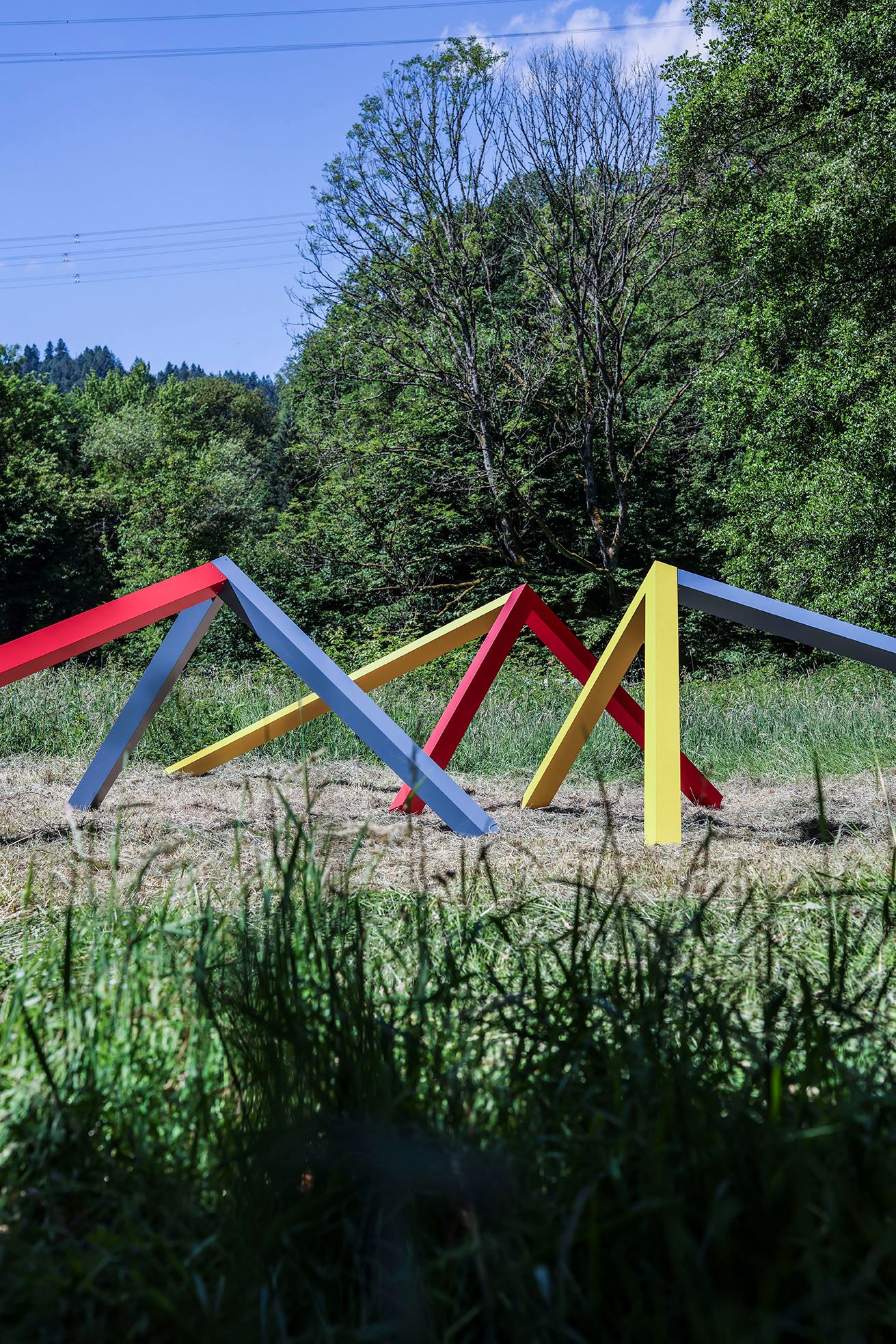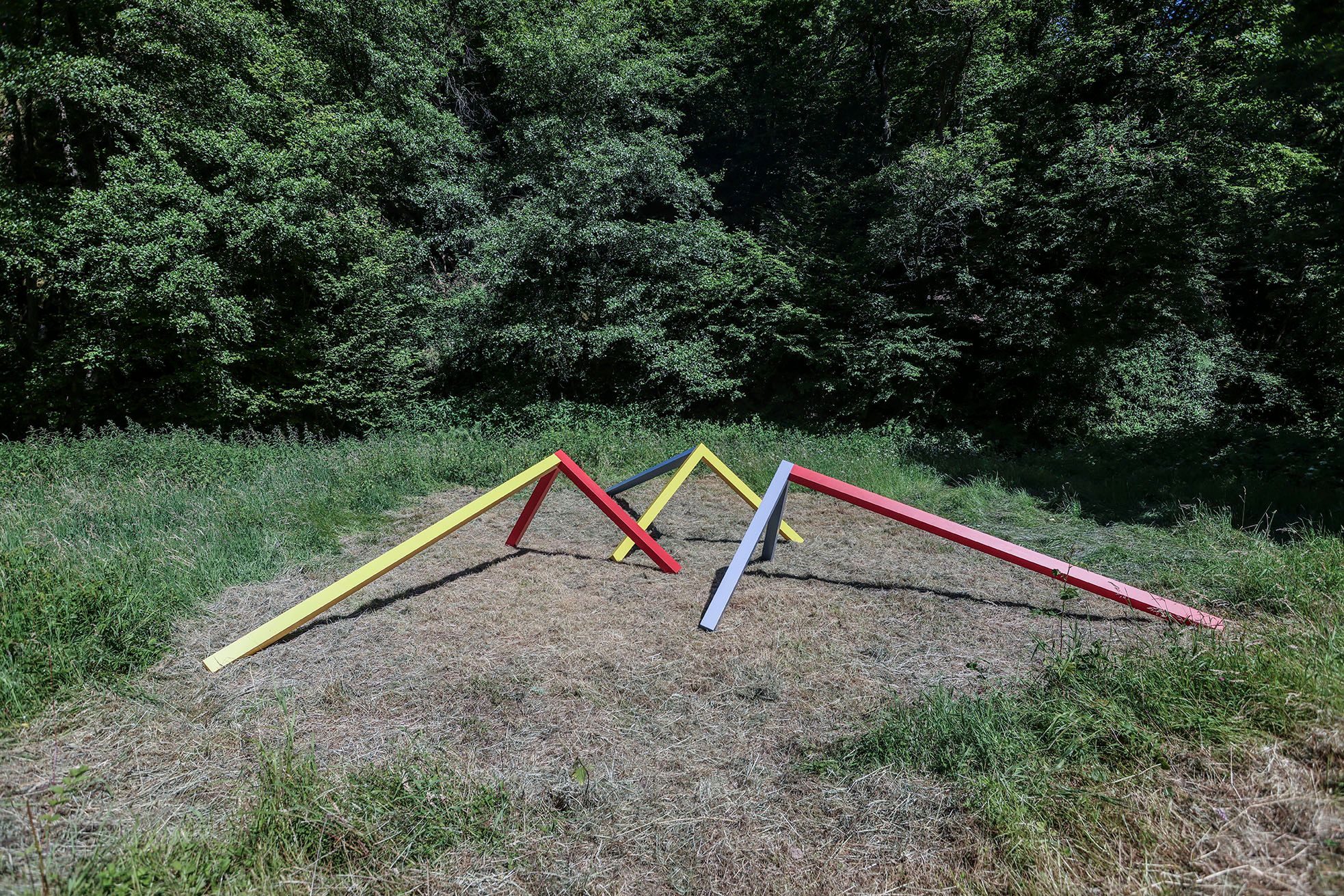 Malerei und Skulptur bedingen sich im Werk von Gary Schlingheider gegenseitig und entstehen aus der Beschäftigung mit der Grenzüberschreitung der beiden Gattungen. Dabei bilden Farbe und Form den Schwerpunkt der Auseinandersetzung des Malers und Bildhauers. Die Serie 3DPLUS VARIANTE 2 lässt sich am Boden liegend, an der Wand lehnend, einzeln, paarweise oder sich überlagernd in Bezug zur räumlichen Situation präsentieren. Ähnlich wie in der Malerei entstehen auch bei den Skulpturen Zwischenräume und sich neu ergebende Flächen innerhalb der Stahlrahmen.