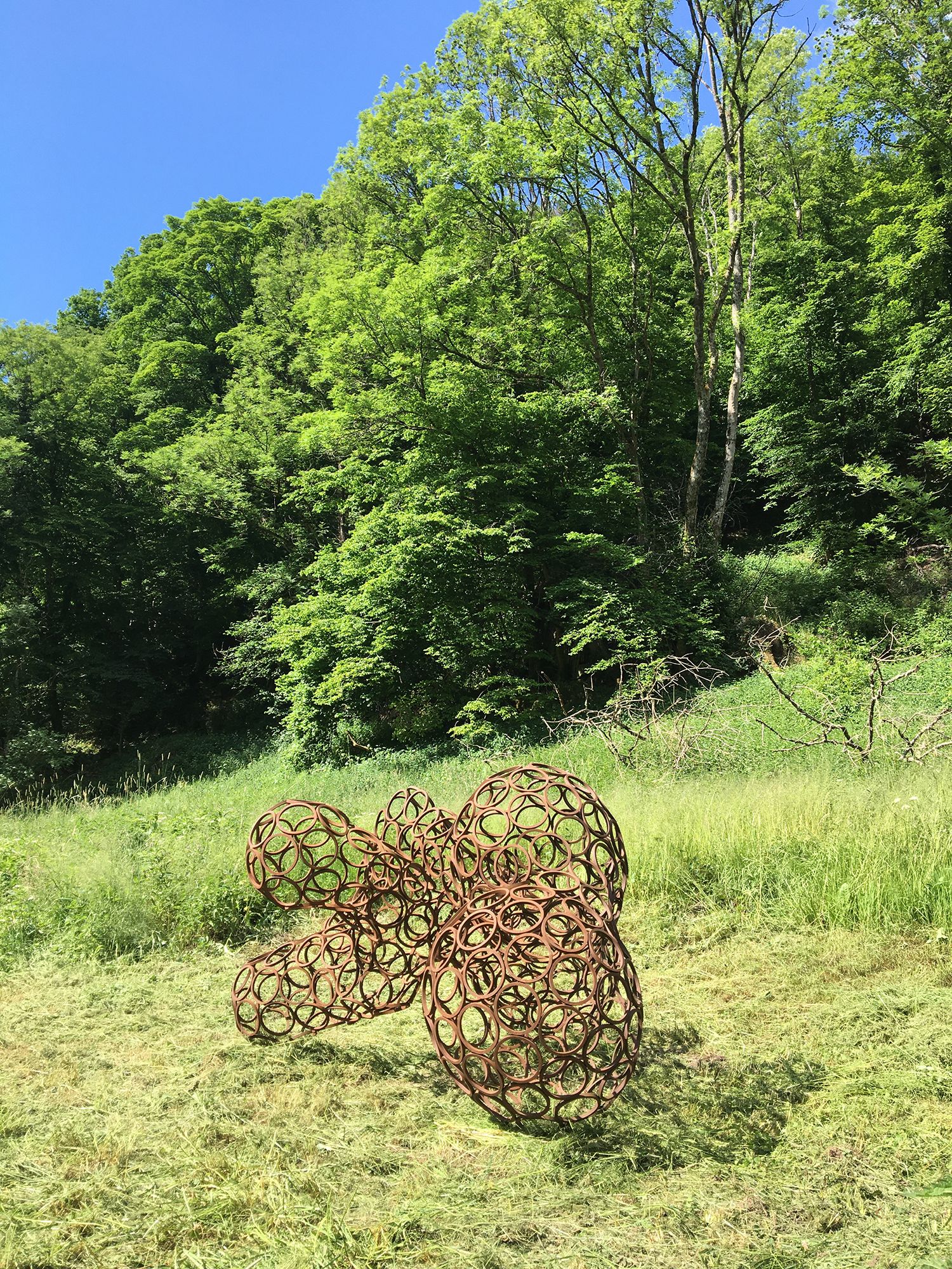 Die Hybride scheinen eher zufällig in additiver Reihung kreisrunder Formen zu biomorphen Körpern gefügt zu sein, die im sparsamen Materialeinsatz dennoch fast körperlos wirken. Die Leerstelle wird zur wesentlichen Komponente, nicht das Material, sondern sein Fehlen macht das Gefüge von Körpervolumen, Innen- und Außenraum, als eine Art Membran wahrnehmbar. Dabei wird deutlich, dass die Arbeiten, ob in annähernd kubistischer oder minimalistischer Formensprache auf sich selbst zurückverweisen. Sie sind weder Darstellungen noch Repräsentationen. Mögen sie an amöbenhafte Organismen, an technische, stoffliche Prototypen erinnern, veranschaulichen sie jedoch auf mannigfache Weise immaterielle Qualitäten: nämlich wie reale Statik visuell in Dynamik überführt wird, wie labil Wahrnehmung ist, wie Außen- und Innenraum in eins fallen können. Aus dem Zusammenhang genommen und aufgeschnitten verlieren die ehemaligen Rohre selbst die Anmutung ihrer früheren Funktion, das einzige, was durch die Ringe nun fließen kann, sind Raum und Luft und Blick. Im Wortsinn wurden sie zu hybriden, das heißt sowohl ‚vermessenen‘ als auch ‚gemischten‘ Körpern. (Ursula Köhler)