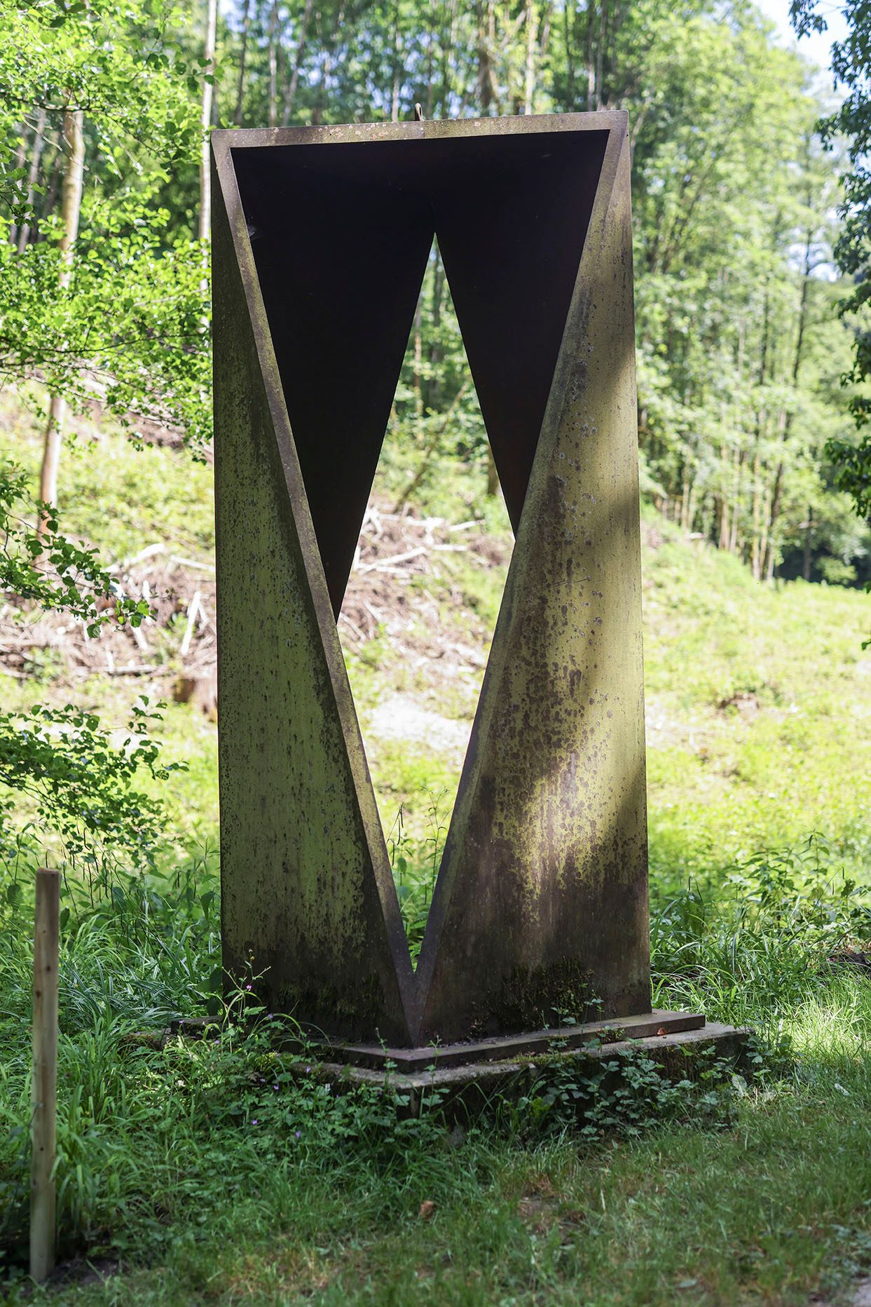 Für die Steinskulpturen und die skulptural wirkenden Metallplastiken Akiyamas erscheint die Dialektik von Geschlossenheit und Offenheit, von Materialität und Leere konstitutiv, und zwar auf eine Weise, die dem analytischen Zugriff hartnäckig Widerstand leistet. Die bei flüchtiger Betrachtung einfach anmutenden Formsachverhalte sind in Wahrheit hochdifferenziert und darum schwer benennbar.Die aus Corten-Platten konstruierte Arbeit verweist mit ihrem Titel „Drei Kubikmeter, halbiert“ auf den konzeptionellen Ansatz der Formfindung und man muss ihn kennen, um die volumetrische Eigenart des gegenläufig diagonal beschnittenen Hohlprismas zu erfassen. Allerdings ist die elegante Wirkung des hochragenden Gebildes nur bedingt auf die Stützung durch dieses Wissen angewiesen. (aus: Peter Anselm Riedl, Ausstellungskatalog Museum Heilbronn 1997)