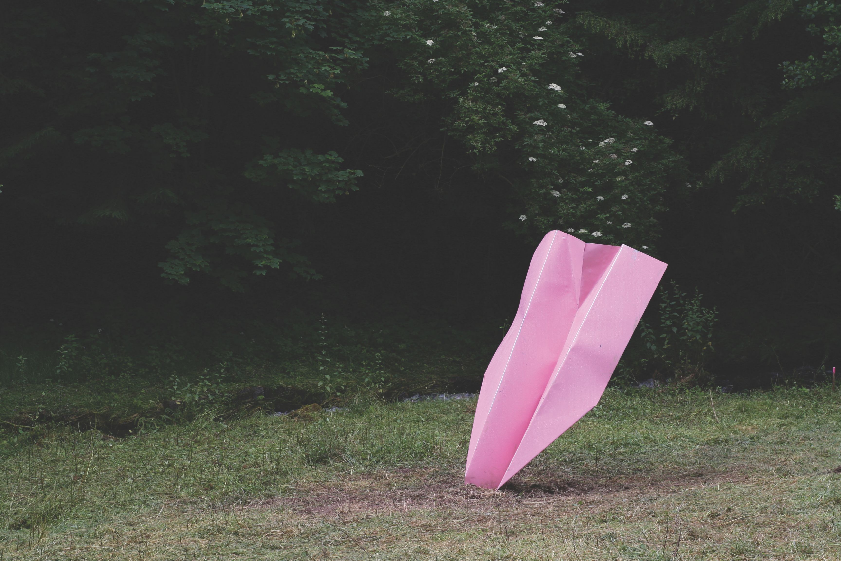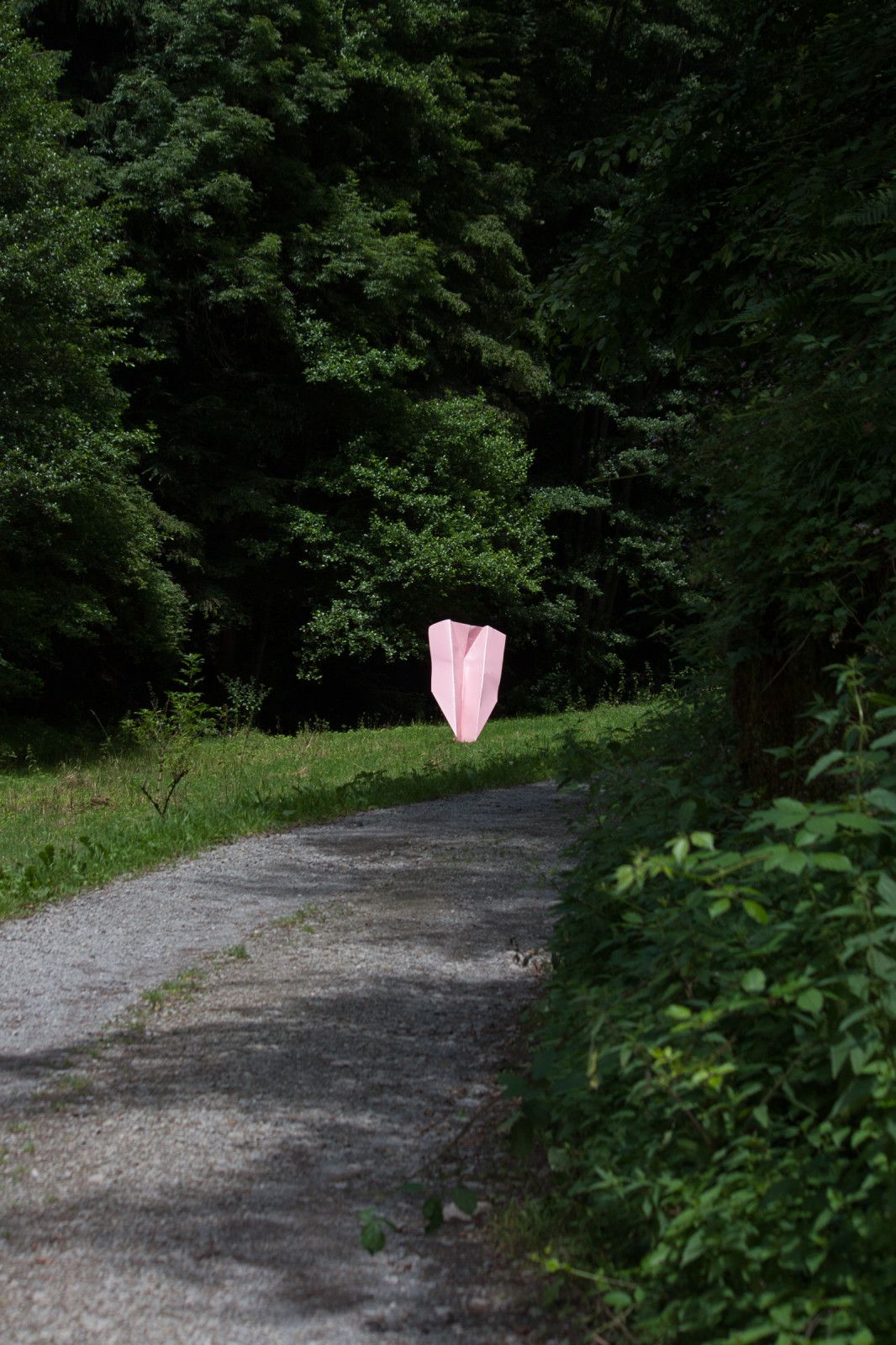 Ein aus Metall gefalteter “Papierflieger”, erinnert an spielerische Momente aus Kinderjahren, die Leichtigkeit jedoch steht im Gegensatz zur Materialwahl. Thematisch knüpft der Papierflieger an die regionale Papierfabrikation an. Während Lackierung und Faltung im Atelier der Künstlerin verortet sind, beschreibt Crash ein mögliches Ereignis, wie es zu der Installation in der Wiese gekommen ist.“ – Nina Laaf