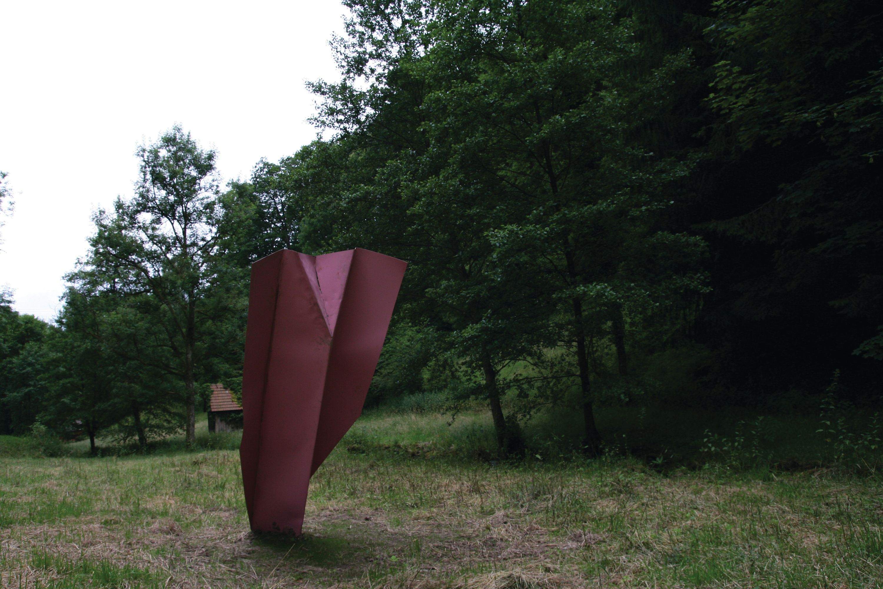 Ein aus Metall gefalteter “Papierflieger”, erinnert an spielerische Momente aus Kinderjahren, die Leichtigkeit jedoch steht im Gegensatz zur Materialwahl. Thematisch knüpft der Papierflieger an die regionale Papierfabrikation an. Während Lackierung und Faltung im Atelier der Künstlerin verortet sind, beschreibt Crash ein mögliches Ereignis, wie es zu der Installation in der Wiese gekommen ist.“ – Nina Laaf
