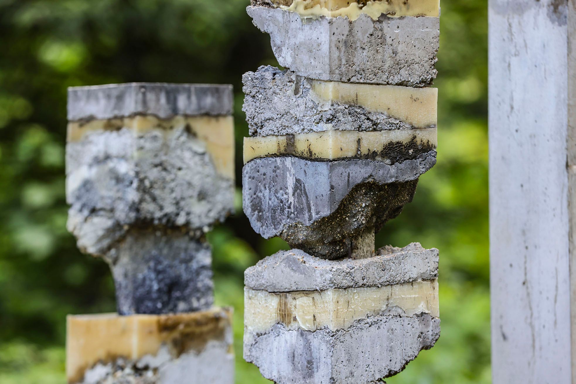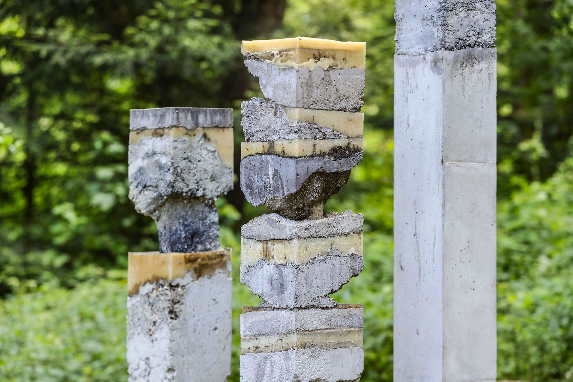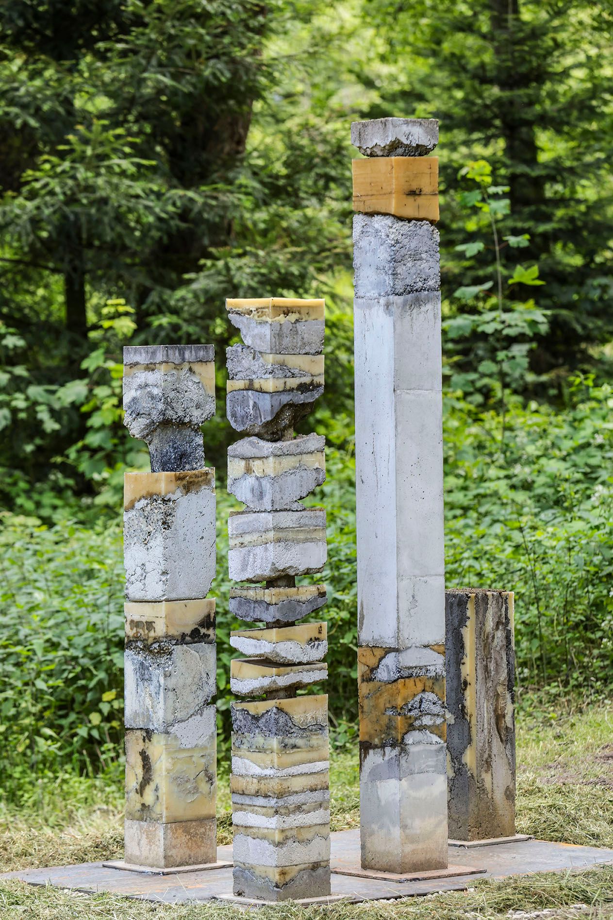 Mit Beton und Wachs treffen Gegensätze aufeinander. Prinzipiell mögen sich diese beiden Materialien ja ganz und gar nicht. Beim Übergang vom flüssigen in den festen Zu stand wollen sie daher vor allem eines: Sich möglichst schnell wieder trennen. Die dabei entstehenden „Kampfspuren“ – man könnte auch von „Energielinien“ sprechen – sind den mitunter bröckelnden Konturen eingeschrieben und die im Wechsel glatten und zerklüfteten Oberflächen bedeuten letztendlich auch ein Ringen um Begriffe wie „Zeit“ und „Erinnerung“. So treten die in lichten und dichten Schichten aufgebauten Stelen als dialogbereites Gegenüber vor den Betrachter und legen Lebensabschnitte sowie die Spuren des Vergangenen offen.