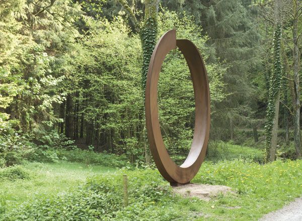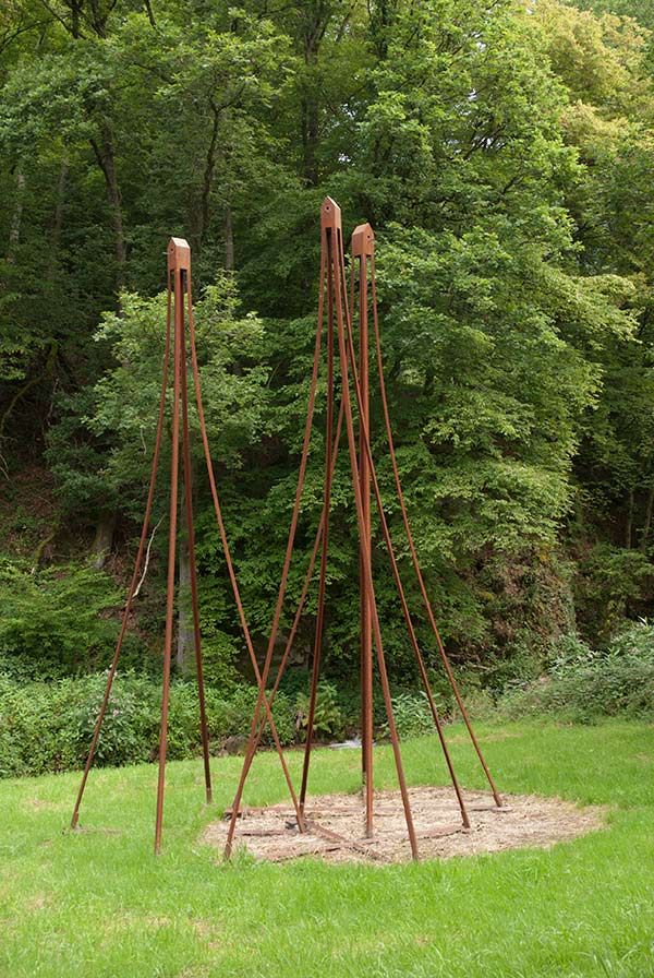 Starrer Stahl, der unter den Händen des Künstlers so starr nicht ist, ist das Material, aus dem Rüdiger Seidt die „Modulfalter“ biegt. Eine rechteckige Platte im Maß 150 x 300 cm wird durch vier Kreisbögen segmentiert und neu zusammengesetzt, die Kanten perfekt verschweißt und verschliffen. Durch unterschiedliche Positionierung der Radien entsteht die konkave und konvexe Form, in geschlossener und in offener Variante. Je nach Art der Aufstellung, liegend oder stehend, erfährt der Betrachter eine andere Wirkung im Anblick. Die Objekte sind in der Zeit um 2005 entstanden, als die Zahl Vier zum Ausgangspunkt für die gesamte weitere Entwicklung des Künstlers wurde. Sie stehen für die vier Elemente Feuer, Erde, Wasser, Luft. Die Arbeit mit Stahl ist dem Feuer zuzurechnen. (Dr. Susanne Ramm-Weber, Offenburg)