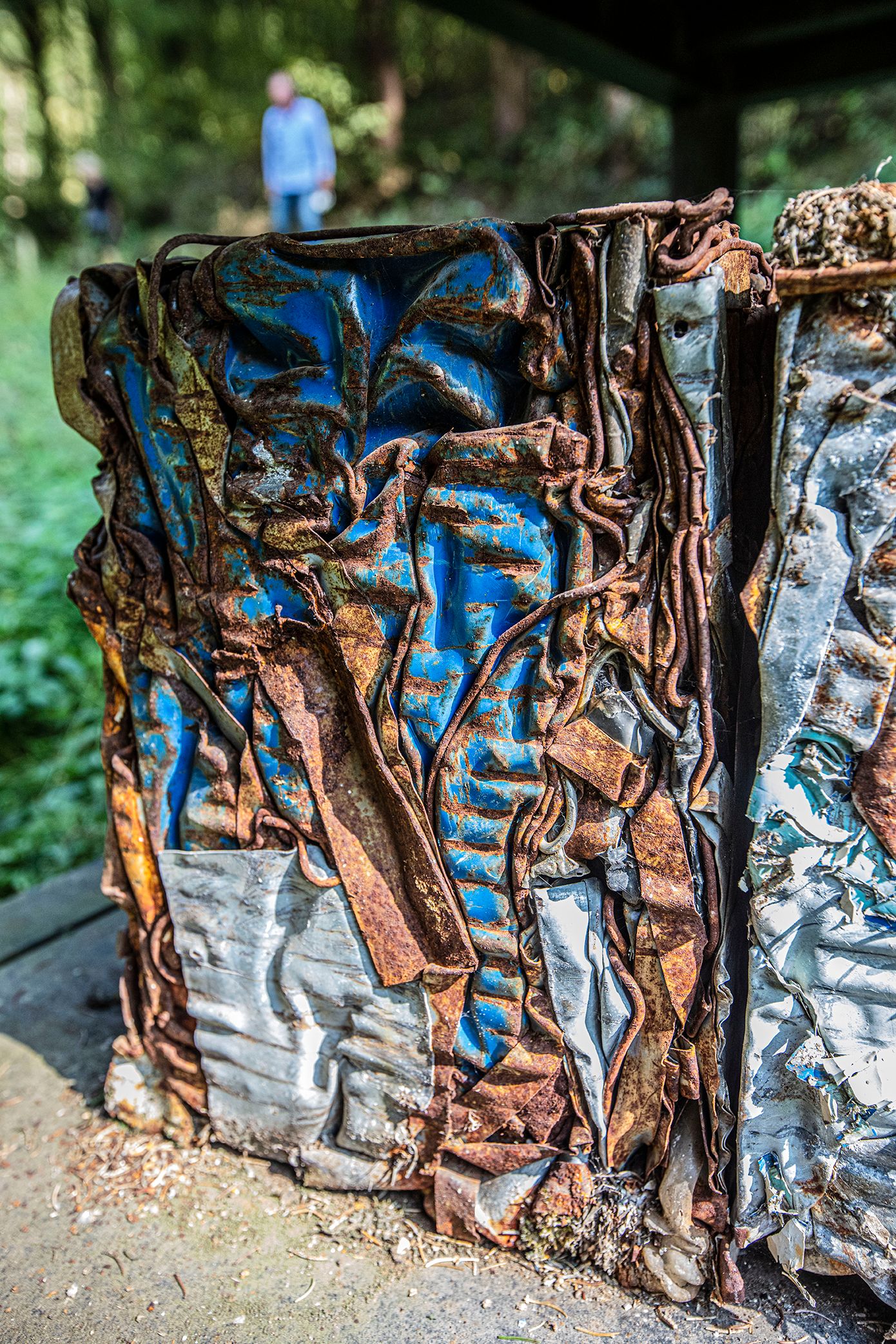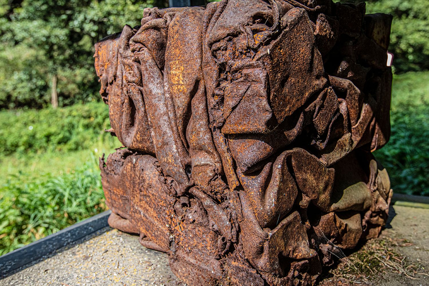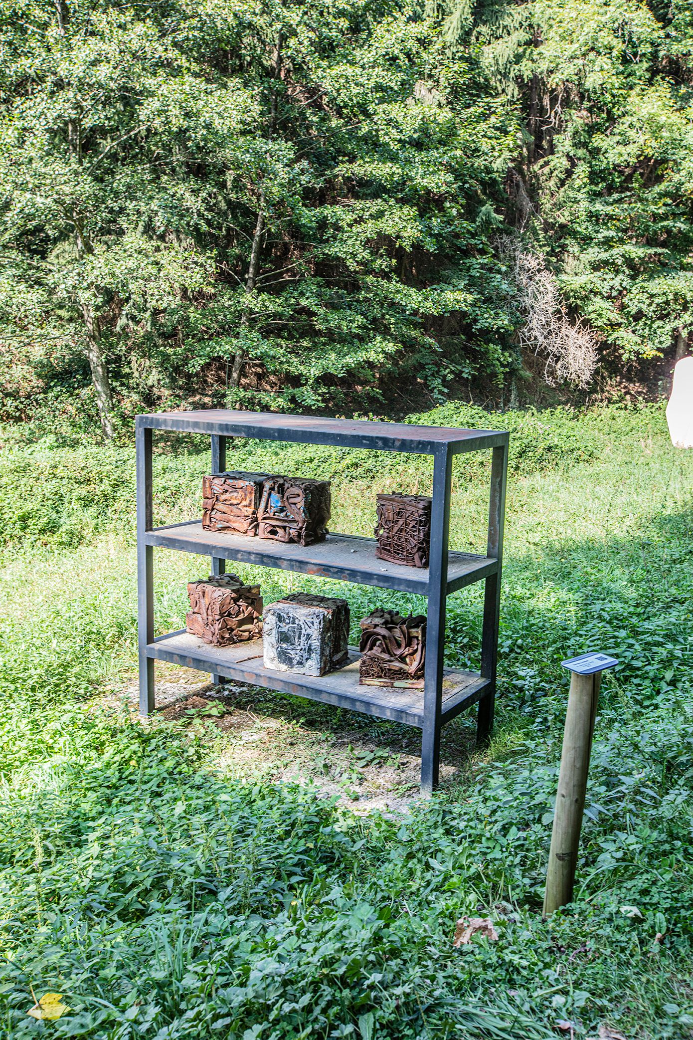 „Die paketierten Eisen-Schrottpakete sind in ihrer Form so wunderschön, dass ich sie als ‚ready-made’ an sich in Ruhe lassen möchte. Ihre ursprüngliche Form und Geschichte sind nur noch ansatzweise zu lesen. Wie kleine, kostbare Diamanten habe ich sie in einem angedeuteten Hochregal nur „eingefasst“ und wie in einem Setzkasten als Schatz zur Schau gestellt.“