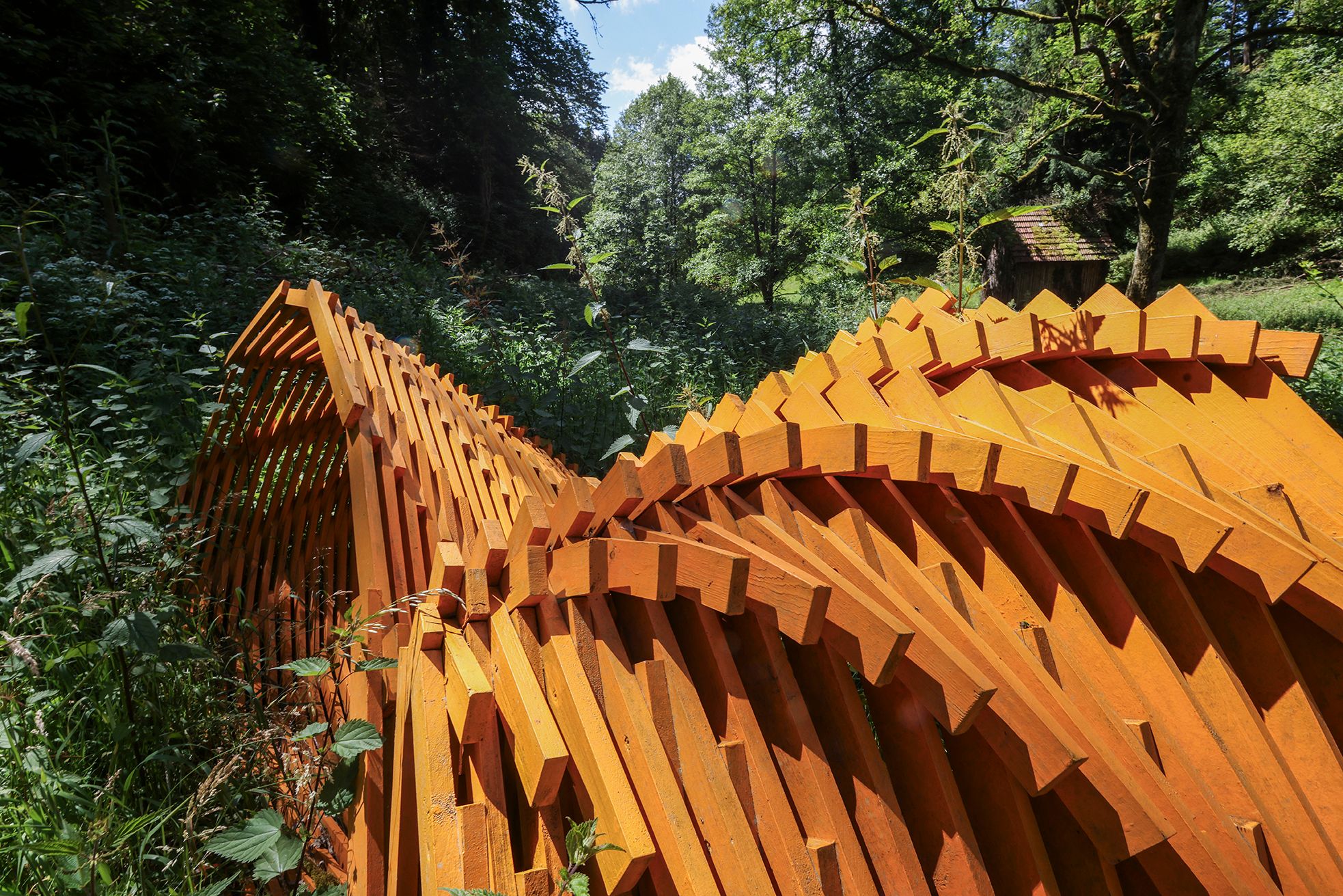 „„Rasender Stillstand“ ist ein Begriff den der Philosoph Paul Virilio für unsere von Digitalisierung und Globalisierung beschleunigte Gesellschaft geprägt hat.Der Begriff lässt sich in formaler Hinsicht auch auf Ulrich Ludewigs Plastik „Momentum“ anwenden. Das Gebilde, eine gekippte und deformierte Endlosschleife aus regelmässig verschobenen Holzelementen breitet sich räumlich in mehrere Richtungen aus und erzeugt damit die optische Illusion einer gegenläufigen Rotation bei gleichzeitigem Stillstand. Darüber hinaus erinnert die Konstruktion an Formen, die aus der Natur vertraut sind, wie Muschel, Schneckenhaus, Blüte - Spiralformen des organischen Wachstums, in dem natürliche und rationale, bzw. konstruktive Prozesse zusammenfließen.“ – Ulrich Ludewig